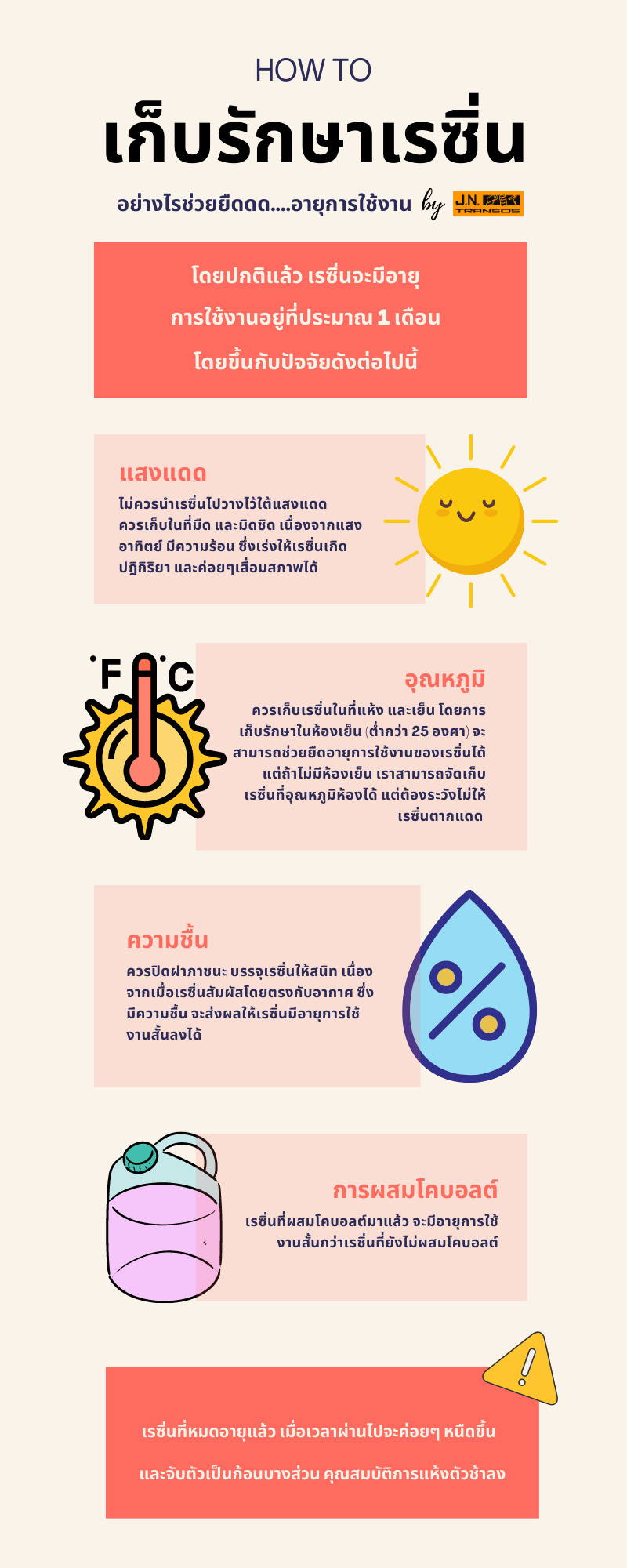- อุณหภูมิ ควรเก็บเรซิ่นในที่แห้ง และเย็น โดยการเก็บรักษาในห้องเย็น (ต่ำกว่า 25 องศา) จะสามารถช่วยยืดอายุการใช้งานของเรซิ่นได้ แต่ถ้าไม่มีห้องเย็น เราสามารถจัดเก็บเรซิ่นที่อุณหภูมิห้องได้ แต่ต้องระวังไม่ให้เรซิ่นตากแดด